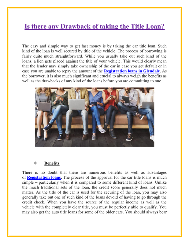 The Registration Loans in Glendale is considered to be a secured loan, where you will be offered with the title to the car in the form of collateral. It is just the way similar like buying the car all over the time again, except the fact that you already have a car. There is no doubt to the fact that the loans usually come with some kind of degree of risk, for the reason that you need to make such kind of the payments, and hence you also need to ensure that you are actually in the situation that needs some amount of the fast cash. On above of this, it is always a great idea to exhaust all such other options available for the quick money making initially, like selling any of the unused possessions which still hold the value, searching for the second or the spare time job, or searching for different set of ways to usually cut back on spending which include things such as using the coupons as well as other discounts.