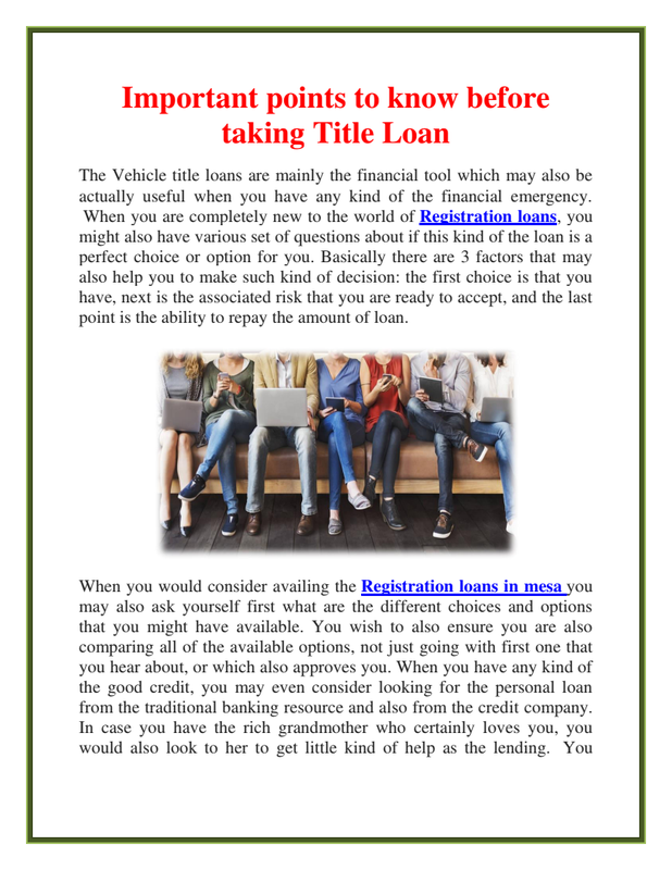 There are so many quick cash loans available in the market. The appearance of these types of loans is mainly accredited to the regular financial crisis the country is facing. Credit card companies and banks as you all understand have taken radical measures to adjust their lending capacity. There are some people that have come to experience that they want to find some other means to meet their requirements without the assistance of credit card companies and banks. Trust it or not, there are some other lending companies that people turn to in crisis times. Car registration loans in mesa have turn into one of the most famous that have assisted people address their financial problems.